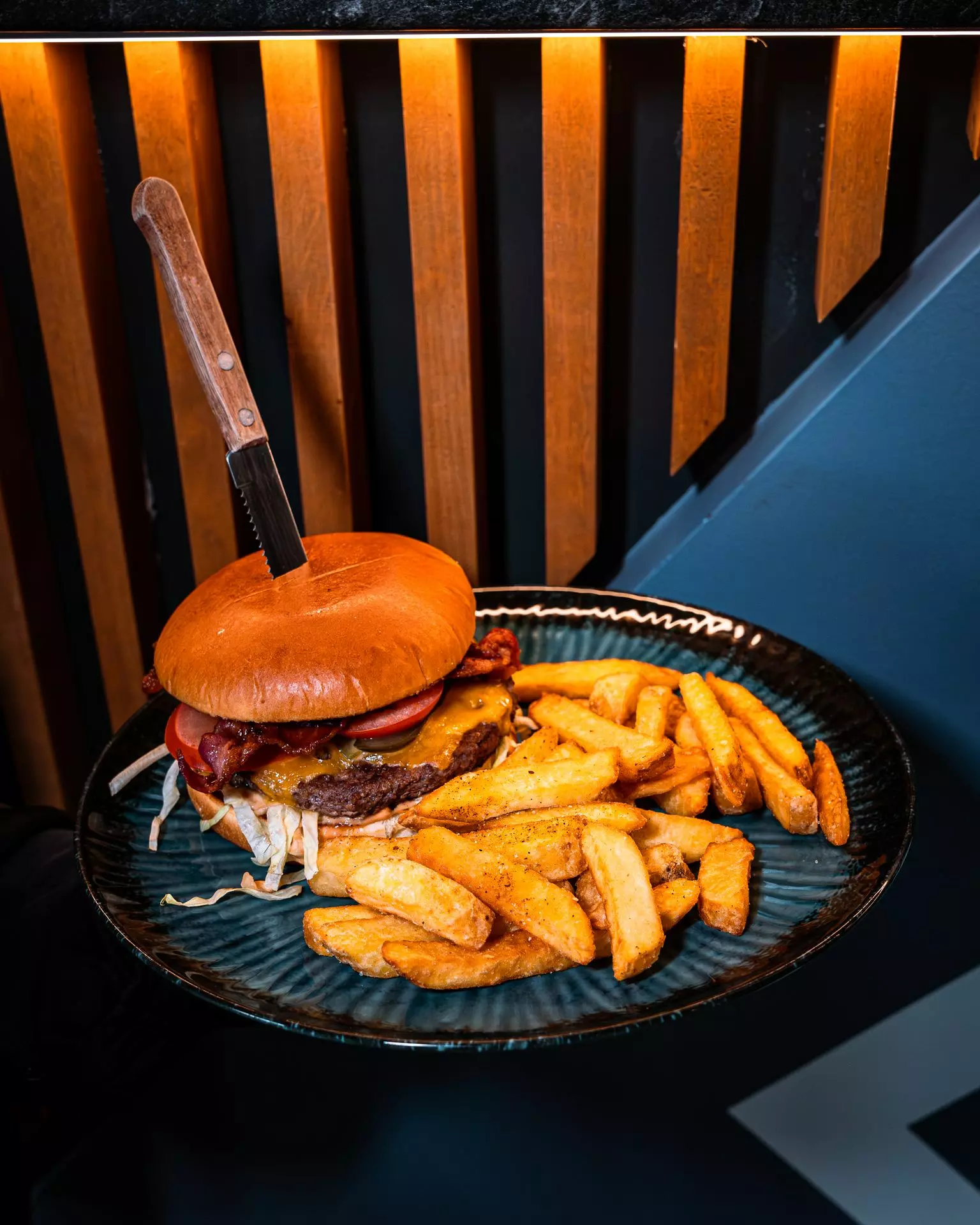 🍔 Marhahúsos hamburger sültkrumplival (hamburger húspogácsát, trappista sajtot, paradicsomot, uborkát, hamburger szószt, bbq szószt, lilahagymát tartalmazó burger)